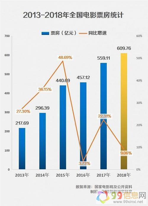 2018年国内电影市场总票房610亿元 同比增8.7%;略低于2017年15%的增速。